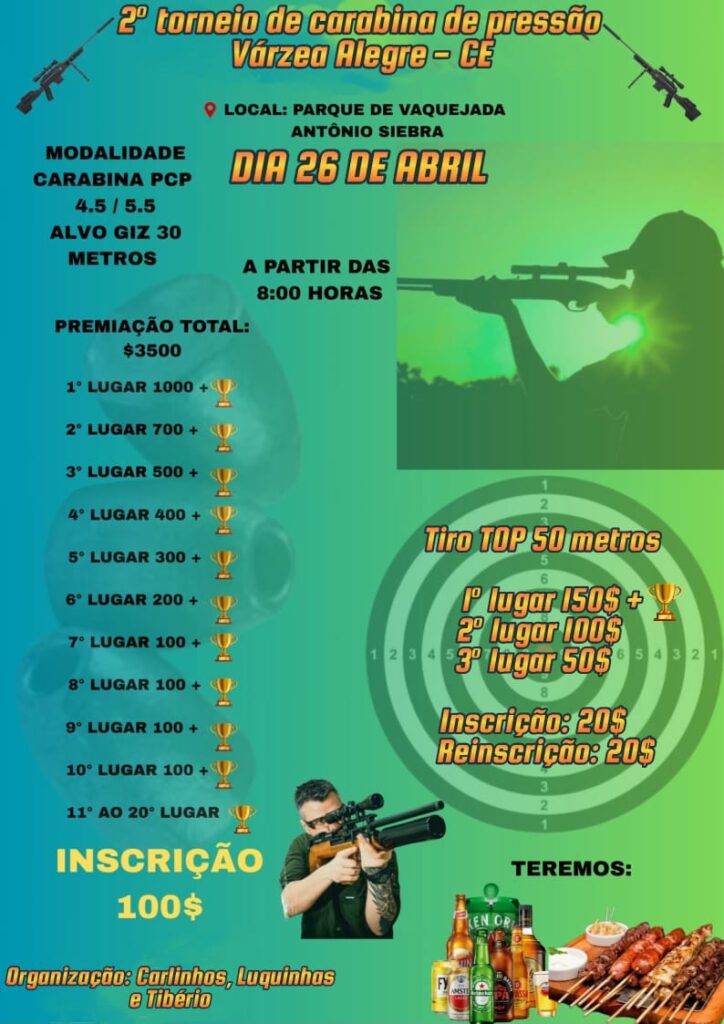 A modalidade carabina PCP 4.5/5.5 alvo giz 30 metros, o evento terá início a partir das 8h com premiação total de R$ 3500 inscrição de apenas R$ 100,00 (cem reais). Lembrando que terá troféu e a partir do 11º lugar apenas troféu. A organização é do: Carlinhos, Luquinha e Tibério.